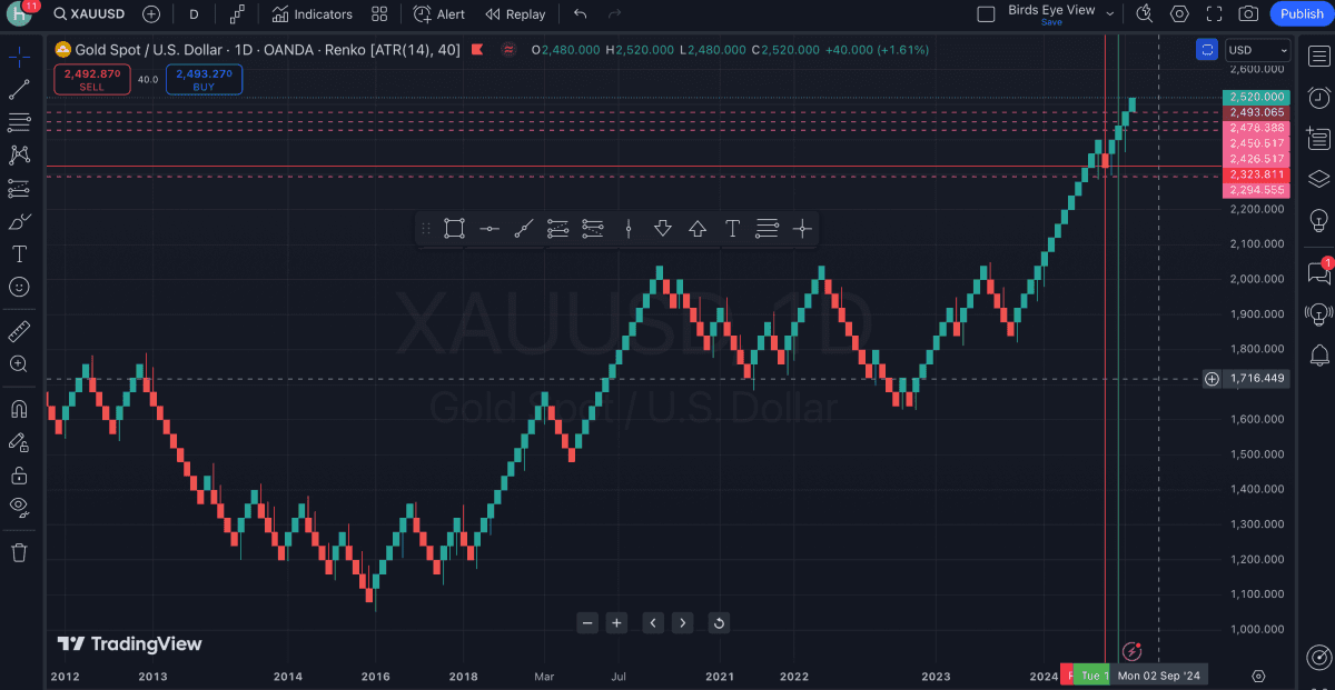 First and foremost, we can deduce price action going back more than 12years! 12 years of trend visualised. We can clearly see that between 2012 and 2013 Gold was range bound in a sideways market. 2013-2016 it was in a downtrend and we can see how the Renko Price action becomes more choppy as we near the bottom. 2016-2018 we see a period of consolidation after hitting rock bottom around 1000$/ounce. 2018-2020 ( mid ) Gold was in a strong uptrend. 2021 brought about some recorrection from 2020 high of 2000$/ounce. We can visualise all of 2024 very easily as a strong uptrend with Gold prices touching a record 2500$/ounce for the first time.